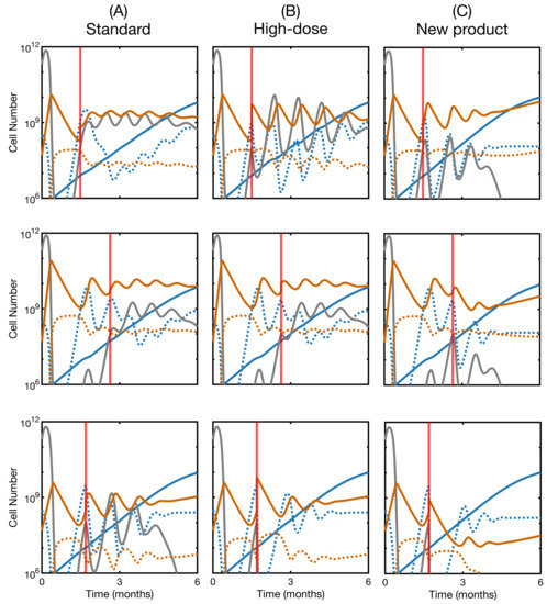 We explored this issue using the mathematical model. For the three non-responding patients in Figure 6, we simulated repeated CAR T-cell therapy in three different ways. First, when the leukemia reached cells, a second dose of CAR T-cells from the original product was reinfused in silico (Figure 8A). Secondly, we did the same thing but increasing the number of cells injected in the second dose (Figure 8B). Finally, we simulated the infusion of a newly manufactured product with improved attributes (Figure 8C), according to the exploration performed in the previous subsection. We observed that a standard re-infusion was not enough to control the relapse. A higher dose could be effective in a subset of patients, while infusing an improved product turned out to be the best option. This agrees with the previous findings that the interaction of product and cancer is critical to understand the therapy outcome. Unlike chemotherapeutic drugs, which are typically modeled as a decaying concentration, this therapy expands and contracts depending on the target. These tangled dynamics are responsible for the qualitative differences with a typical dose fractionation scheme, and suggests the need for a deeper investigation of the molecular basis of T-cell and cancer cell interaction. When infusing a different improved CAR, this second product eventually became dominant in the CAR T-cell subpopulation (Figure S6). Clonal dynamics of this kind within the product have already been reported [53], opening the door to an evolutionary exploration of the therapy, another feature that is absent in other types of treatment.