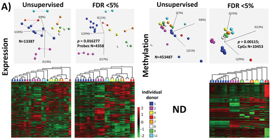 As a first step after generating expression and methylation profiles of the individual non-pooled 24 cumulus samples, we investigated whether we could recognize the samples and group them based on their original female donor, i.e., if there were an inter-individual signature. Unsupervised clustering illustrated in heatmaps and 3D-PCA plots showed this to be the case (Figure 1A). In fact, the expression data clearly demonstrated that the cumulus clusters samples from the same donor were grouped together and were closer to each other than the samples from other donors (represented by the nearest neighboring lines connecting the spheres in Figure 1A, upper left, and the unsupervised hierarchical clustering on the heatmaps, lower left). What emphasized the inter-individual signature effect and excluded the effect of experimental procedure(s) was the fact that the samples were derived from two different treatments but from the same donor (i.e., donated at different hormone stimulation cycles) and were still grouped closely together. This held true for donor 1 (eight cumulus samples from two treatments: blue annotation) and donor 2 (four cumulus samples from two treatments: pink annotation). The latter results emphasized the accurate experimental procedures that maintained individual sample-specific information.