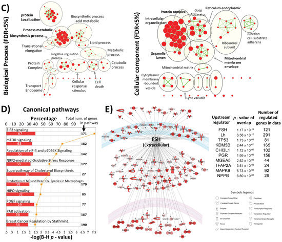 Upstream regulator: In this analysis, the IPA database searches for molecules or proteins, such as hormones and transcription factors, that can influence the expression of genes in the given gene sets (i.e., in genes showing significant variability). Based on the set of variable gene expression, this analysis predicted that FSH and LH (two main hormones used in the treatment) would have the top overlap p-value between the total possible number of genes regulated by these hormones and the expected genes regulated by these hormones in the dataset (Figure 1E). This finding reflected a gene expression signature of a possible quantitative effect of the drugs used either regarding the actual dose effect in relevant tissue or the metabolic effect influenced by genetic polymorphism.