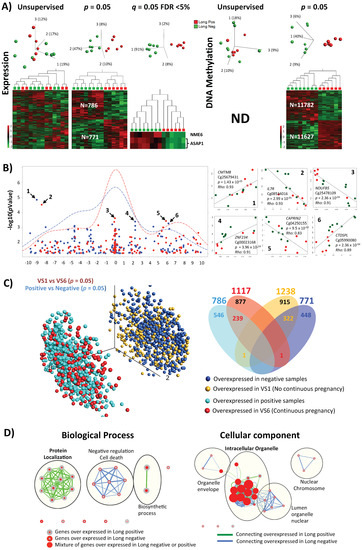 Taking into consideration the result of the previous section, we next analyzed the samples derived via the long protocol only. While analysis of all data from the long and the short protocols revealed no significant differences, by stratifying the samples according to the stimulation protocol, we obtained a significant number of differentially expressed genes from the long protocol samples (Figure 2). Non-supervised hierarchical clustering did not reveal clear grouping according to pregnancy outcome. However, 3D-PCA plots showed that the positive samples were largely aligned according to PCA component 3, yet without suggesting the alignment reason. Moreover, supervised clustering at p = 0.05 revealed 786 and 771 under- and overexpressed probes, respectively, in positive samples. The most significant results were obtained at FDR < 0.05 with three probes corresponding to genes NME6 and ASAP1, which were underexpressed in positive samples (Figure 2A, left panel). These two genes were also found to be top correlated with two of the clinical parameters: endometrium size and lead follicle size slope (Supplementary Figure S6). More than 23,000 different CpGs were found to be differentially methylated at p = 0.05, but there was no significance at FDR < 0.05 (Figure 2A, right panel). The top 10 significant CpG sites are shown at Supplementary Figure S7A. We next studied the correlation between the expression of differentially expressed genes and their underlying methylation in a region covering 10 Kb upstream and 10 Kb downstream of the TSS. Here, we also found an expected surplus of negative correlations, especially at the TSS (Figure 2B).