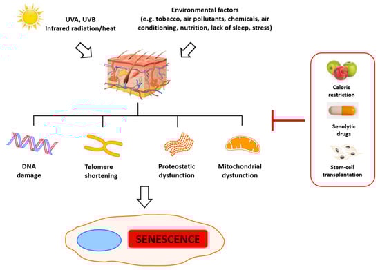 Key senescence drivers. Physical, chemical, and biological factors (e.g., tobacco, air pollution, chemicals, air conditioning, nutrition, sleep deprivation, stress, heat, UVA, and UVB) induce DNA damage, telomere erosion, oxidative stress, and proteostatic dysfunction, and consequently lead to cell senescence. Caloric restriction, senolytic drugs, and stem-cell transplantation constitute promising antisenescence strategies.