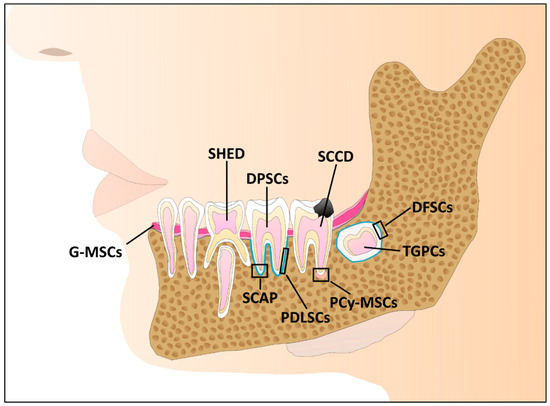 Overview of the stem cells with an oral and dental origin. The dental tissue is a rich source of multipotent and mesenchymal stem cells. Dental pulp stem cells (DPSCs), dental follicle stem cells (DFSCs), stem cells from exfoliated deciduous teeth (SHED), stem cells from the apical papilla (SCAP), periodontal ligament stem cells (PDLSCs), gingival mesenchymal stem cell (G-MSCs), tooth germ stem cells (TGSCs), mesenchymal stem cells from periapical cysts (PCy-MSCs), and dental pulp stem cells from carious deciduous teeth (SCCD) can be isolated from this region.