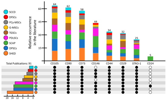 The Mesenchymal and Tissue Stem Cell Committee of the International Society for Cellular Therapy set minimal criteria to define stem cells as MSCs [43,44,45]. Among the defined criteria, the CD markers CD105, CD90, and CD73 are supposed to be positive, while CD11b, CD14, CD34, and CD45 should be negative. DSCs share the described common features with ASCs isolated from other sources [46]. The marker expression of all these different mesenchymal stem cells from the oral origin is in general similar, but it also shows some small differences. Figure 2 summarizes the detailed marker expression profile of the different DSCs. The analysis of the most common markers was done by a literature search of 91 total publications published within 2000 and 2020 (Figure 2) [22,24,27,30,47,48,49,50,51,52,53,54,55,56,57,58,59,60,61,62,63,64,65,66,67,68,69,70,71,72,73,74,75,76,77,78,79,80,81,82,83,84,85,86,87,88,89,90,91,92,93,94,95,96,97,98,99,100,101,102,103,104,105,106,107,108,109,110,111,112,113,114,115,116,117,118,119,120,121,122,123,124,125,126,127]. The literature was scanned for articles discussing the different stem cell types and their isolation and characterization. Since some stem cells were discovered earlier than others, different amounts of articles were found and used to describe the marker expression of these stem cell types. The most common positive markers expressed in all multipotent stem cell types from dental tissues are CD105, CD90, CD73, and CD146, whereas CD146 was not described to be expressed in SCCD yet. This might be due to the low number of publications for that cell type [31,128,129].