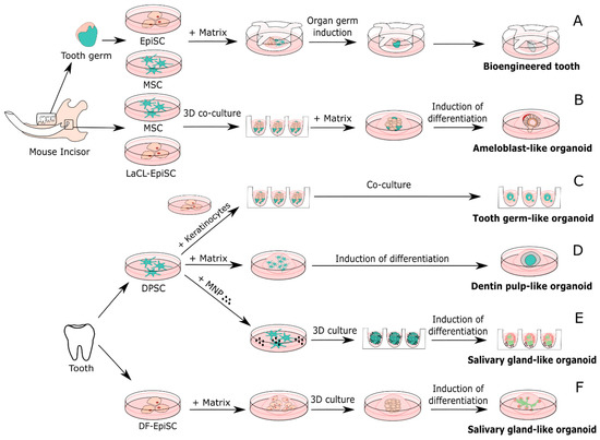 Organoids and organ germs from dental tissues. (A) Scheme of the “organ germ method” for the generation of a bioengineered tooth, with cells derived from a tooth germ, cultured in compartments in collagen, inducing the formation a tooth germ in vitro and finally give rise to a bioengineered tooth [193]. (B) Scheme of the generation of an ameloblast-like organoid from EpiSCs in the presence of dental mesenchyme, cultured in non-adherent plates, and further propagated in Matrigel with inducing factors [206]. (C) Scheme of the generation of tooth germ-like organoids from DPSCs in the presence of keratinocytes in a low-adherent culture [207]. (D) Scheme of the formation of dentin pulp-like organoid from DPSCs [208]. (E) and (F): Scheme of the formation of salivary gland-like organoids by different methods and cells: (E) Organoid formation from DPSCs using magnetic nanoparticles and low attachment conditions [209], (F) Organoid formation from DF-EpiSCs in a Matrigel matrix [210].