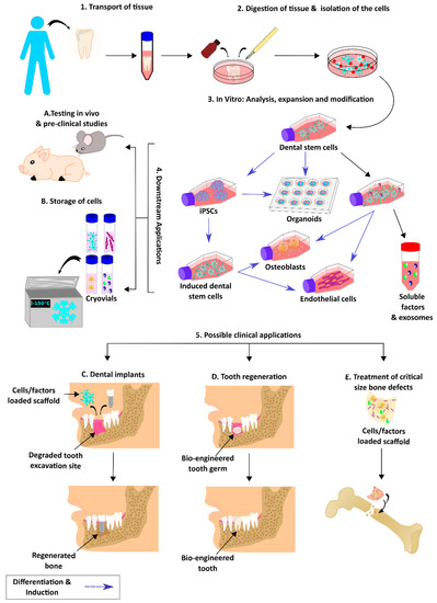Regenerative medicine is an interdisciplinary field that is concerned with finding ways to repair or replace damaged tissues and organs [1]. Stem cells are a fundamental part of regenerative medicine, and since their isolation from the bone marrow in the 1970s they have been isolated from various tissue sources [2,3,4,5]. Dental tissues such as wisdom teeth or periodontal ligaments are relatively new sources for stem cells. Dental stem cells (DSCs) are multipotent and can give rise to several differentiated cells an ability vital for tissue maintenance [6]. DSCs could be used in various areas: in basic research to study developmental processes, such as development of the tooth or disease modeling and pharmaceutical investigations, or for regenerative medicine, especially if induced pluripotent stem cells (iPSCs) are generated from them. This review introduces the isolation, characterization, and subsequent applications of DSCs in research. These include the generation of immortalized dental stem cell lines, iPSCs, and organoids. Osteogenesis and angiogenesis are vital processes for hard tissue regeneration; the potential of DSCs for these two processes will be discussed in this review as well. Another focus will be the effect of growth factors and environmental modulators on the differentiation of DSCs. The potential of translating the use of DSCs for bone tissue regeneration will be the focus in this review. In detail, multiple strategies for utilizing DSCs in hard tissue regeneration such as cell sheets and cell free therapy will be explored. In addition, scaffold-based approaches, including the different scaffold materials and drug release strategies that could be used to support the use of DSCs in tissue regeneration will be discussed. Finally, current clinical trials using dental stem cells will be summarized.