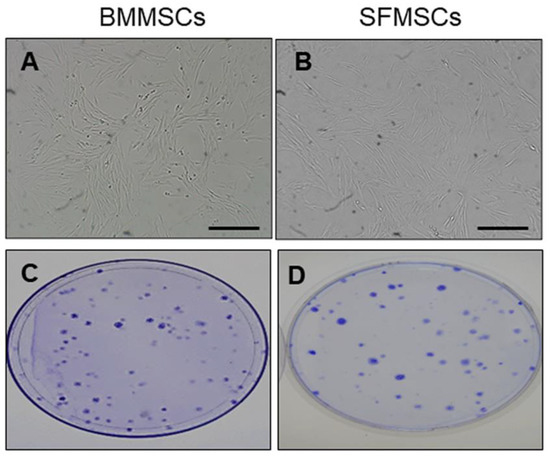 The colony forming unit assay was conducted with slight modification, according to traditional methods [20]. Briefly, BMMSCs and SFMSCs (P1, 1 × 102) were seeded on 10 cm2 diameter dishes (Thermo Scientific, Waltham, MA, USA) and cultured using DMEM-F12 regular growth medium. When clusters of colonies were formed, at day 7, cells were fixed and stained with 0.5% crystal violet (Sigma-Aldrich, Saint louis, MO, USA).