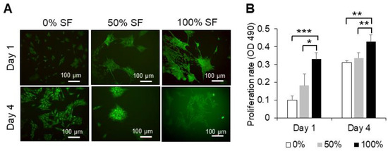 Proliferation rate and calcein staining for viability of BMMSCs co-cultured with autologous synovial fluid. (A) Representative BMMSCs after exposure to different concentrations of autologous synovial fluid at days 1 and 4. MSCs were loaded with calcein AM (stains live cells green) and propidium iodide (stains dead cells red). (B) Proliferation was evaluated by MTS assay; the absorbance was measured at 490 nm. * p < 0.05, ** p < 0.01 and *** p < 0.001. Quantitative data are expressed as mean ± SD (n = 3) and were analyzed using one-way ANOVA, with Tukey’s comparison test as a posttest. p < 0.05 was considered statistically significant. One representative experiment is presented from three different experiments using cells from different donors (n = 3), each performed in triplicate. Scale bars = 100 µm.
