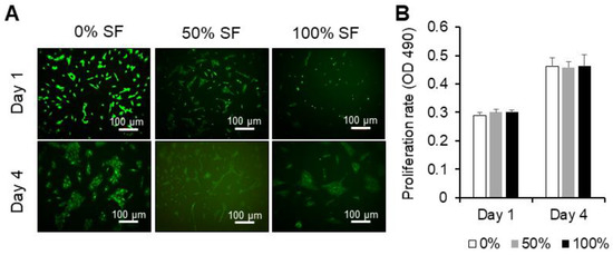 Proliferation rate and calcein staining for viability of BMMSCs co-cultured with allogeneic synovial fluid. (A) Representative BMMSCs after exposure to different concentrations of allogeneic synovial fluid at days 1 and 4. MSCs were loaded with calcein AM (stains live cells green) and propidium iodide (stains dead cells red). (B) Proliferation was evaluated by MTS assay; the absorbance was measured at 490 nm. Quantitative data are expressed as mean ± SD (n = 3) and were analyzed using one-way ANOVA, with Tukey’s comparison test as a posttest. p < 0.05 was considered statistically significant. One representative experiment is presented from three different experiments using cells from different donors (n = 3), each performed in triplicate. Scale bars = 100 µm.