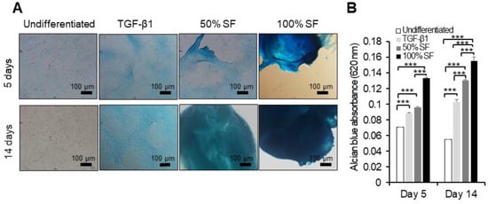 Stimulation of BMMSCs with autologous synovial fluid or regular chondrogenic medium showed a significant increase in their GAG content compared to unstimulated cells (p < 0.001) at days 5 and 14. Adding 100% concentration of synovial fluid exhibited significantly higher GAG content in BMMSCs compared to 50% (p < 0.001) at days 5 and 14. Moreover, the 50% and 100% concentrations of synovial fluid induced a high amount of GAG compared to the regular chondrogenic medium (p < 0.001) at day 14 (Figure 4A,B).
