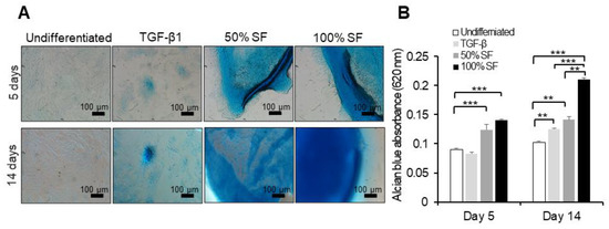 Evaluation of chondrogenic differentiation in the presence of allogeneic synovial fluid. BMMSCs were cultivated as monolayer in the presence of 50% and 100% of allogeneic synovial fluid or chondrogenic differentiation medium containing TGF-β1 for up to 14 days. The MSCs were stained using Alcian blue. (A) Photomicrographs of MSCs at days 5 and 14 show cartilage glycosaminoglycans (blue) indicative for chondrogenic differentiation. (B) Total glycosaminoglycan (GAG) production in the monolayer for different time points. ** p < 0.01, *** p < 0.001. Quantitative data are expressed as mean ± SD (n = 3) and were analyzed using one-way ANOVA, with Tukey’s comparison test as a posttest. p < 0.05 was considered statistically significant. One representative experiment is presented from three different experiments using cells from different donors (n = 3), each performed in triplicate.