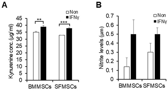 Indoleamine-2,3-dioxygenase (IDO) and nitric oxide (NO) expressions in the conditioned medium stimulated with interferon-gamma (IFN-γ). (A) Kynurenine assay, the functional IDO activity was evaluated by measuring the content of kynurenine in the conditioned media of BMMSCs and SFMSCs stimulated with IFN-γ (100 ng/mL) for 48 h. ** p < 0.01, *** p < 0.001. (B) Concentration of nitrite following stimulation with IFN-γ for 48 h. All values represent mean ± SD (n = 3). Statistical analysis was carried out using the Student’s t-test with p < 0.05 as significant. Experiments were performed on cells from three different donors (n = 3), each in triplicate.