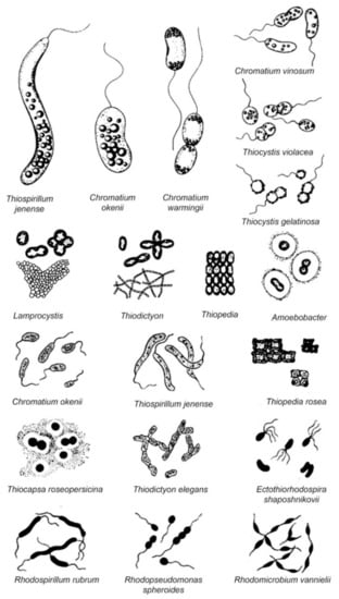 Another frequently mentioned division is according to the ability to obtain energy by means other than using phototrophy. This division has two groups: the first group are specialized species, dependent on a strictly anaerobic environment and are obligate phototrophs capable of photoassimilate only pyruvate or propionate in the presence of sulfide and CO2. Representatives of this group include Chromatium okenii, Chromatium wissei, Allochromatium warmingii, Isochromatium buderi, Thiospirillum jenense and Thiococcus pfenigii. The second group are capable species and photoassimilate many diverse organic substrates. Most of these species are able to grow in the absence of reduced sulfur compounds and use organic substrates as electron donors for photosynthesis. Some species of this group are even able to grow chemoautotrophically or chemoheterotrophically. This group includes Allochromatium vinosum, Thiocystis violacea, Thiocapsa roseopersicina, Thiocapsa rosea, Thiocapsa pendens and Lamprobacter modestohalophilus [10,38]. The morphological diversity of photothrophic bacterial cells, the most common in the aquatic environment has been described previously and presented in Figure 2.