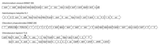 These clusters presented in Figure 3 were found in all representatives except Chlorobium ferrooxidans and Chloroherpeton thalassium. The absence of this region is particularly interesting in Chloroherpeton thalassium, as this bacterium oxidizes sulfides to form elemental sulfur, which it stores outside the cell. However, this sulfur is only oxidized very slowly, which is probably due to the absence of the Dsr system. The alternative route of oxidation of sulfur granules is not yet clear, but the most likely is the involvement of RuBisCO-like protein (RLP), which is found in all representatives of green sulfur bacteria [71].