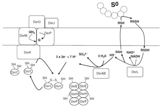 Last but not least, the catabolic enzyme sulfite reductase (DsrAB) is operating a biologically-reverse function. This means that instead of decomposing sulfites into sulfides, it assimilates sulfides to form sulfites. Such a functioning protein has been found in Allochromatium vinosum, but it has been found that this protein is not essential for sulfide degradation but is essential for the oxidation of intracellularly deposited sulfur [56,57].