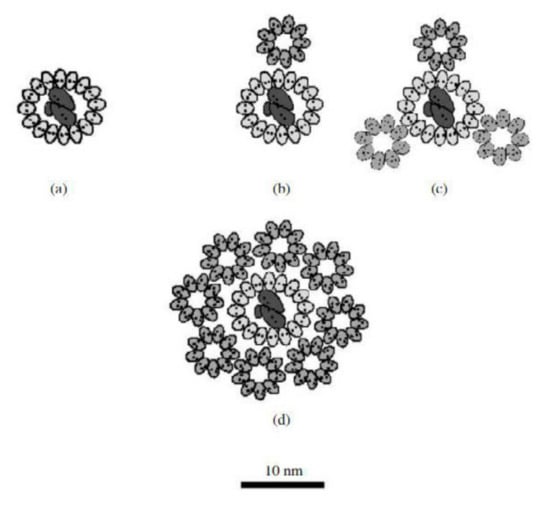 Model of a possible arrangement of a photosynthetic unit (LH1 and LH2 are localized around the reaction center (RC). (a) LH1 + RC Rhodospirillum rubrum growing at high light inten-sities, (b) LH1 + RC + LH2 Rhodopseudomonas palustris growing at low light intensities, (c) LH1 + RC + LH2 Rhodopseudomonas palustris growing at high light intensities, (d) LH1 + RC + LH2 Al-lochromatium minutissimum growing at low light intensities (data from Solovev and Erokhin, 2008 [86]).