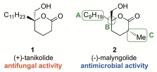 - Miyamoto, H.; Iwamoto, M.; Nakada, M. A new asymmetric total synthesis of enantiopure (-)-Malyngolide. Heterocycles 2005, 66, 61–68. [Google Scholar] [CrossRef]