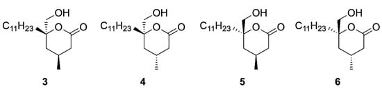 In addition, to our reported synthesis of (+)-tanikolide 1, we wished to probe the biological importance of the position of the methyl group and hence the four β-methyl modified analogues (3–6) were synthesised using the same δ-lactone forming methodology with the aim to enhance the antifungal activity against C. albicans (Figure 2) []. These analogues (3–6) were subsequently biologically evaluated, the results of which we report now (Table 1).