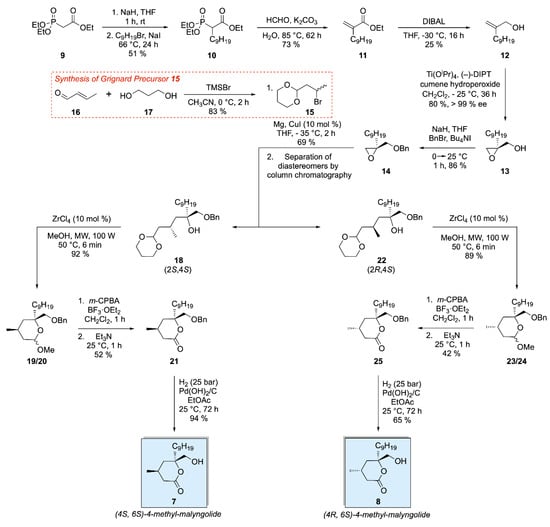 - Enders, D.; Knopp, M. Novel asymmetric syntheses of (−)-malyngolide and (+)-epi-malyngolide. Tetrahedron 1996, 52, 5805–5818. [Google Scholar] [CrossRef]
