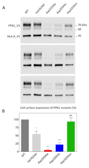 2.1. Effects of the Asp325Ala, His, and Asn Mutants on the Cell Surface Expression of Human FPN1 and Its Ability to Export Iron