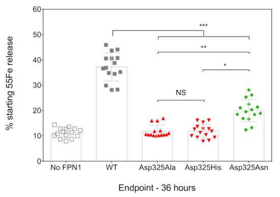 The ability of the FPN1 mutants to export iron out of the cell was investigated using radiolabeled transferrin-bound iron. Cultured HEK293T cells were transiently transfected with plasmids encoding FPN1-V5 fusion proteins, grown in 20 µg/mL 55Fe-transferrin for 16 h, washed, and placed in serum-free medium. The amount of 55Fe exported into the supernatant was measured after 36 h, using cells transfected with the commercial pcDNA3.1-V5-His vector as a negative control (no FPN1). As shown in Figure 2, the cells transfected with the WT FPN1-V5 construct displayed a threefold increase in iron release. None of the tested Asp325 mutants were able to cause iron release in amounts comparable to the WT FPN1 (p < 0.001). The observed differences were similar to those reported by Deshpande et al., with massive reductions in iron efflux for the Asp325Ala and Asp325His mutants, and a considerably smaller effect of the Asp325Asn mutant (325Asn vs. 325His: p < 0.05; 325Asn vs. 325Ala: p < 0.01).