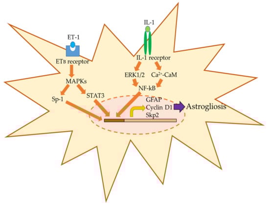 Multiple intracellular signaling pathways control the conversion to reactive astrocytes, and the expected signal mechanisms are summarized in Figure 1. Signal transducer and activator of transcription 3 (STAT3) is closely related to astrogliosis. In FPI-induced TBI rats, confocal microscopy revealed that STAT3 was localized primarily within astrocytic nuclei []. We suggest that STAT3-mediated regulation of cell proliferation-related proteins, such as cyclin D1 and S-phase kinase-associated protein 2, underlies ET-induced astrocytic proliferation []. Additionally, ET-induced astrocytic proliferation was triggered by the phosphorylation of specificity protein-1, a transcriptional factor involved in the activation of mitogen-activated protein kinase (MAPK) in cultured astrocytes [].