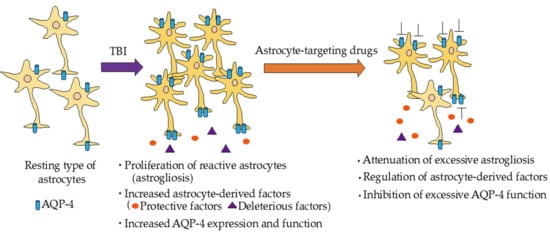 In patients with TBI, increased reactive astrocytes are observed in damaged areas []. A recent study found that levels of astrocyte-derived neurotoxic exosome complement proteins that elicit damage to synapses and injuring neurons were also increased in TBI patients []. Emerging evidence suggests that astrocytes elicit beneficial and detrimental roles in the pathogenesis of TBI, including neuroinflammation, brain edema, disruption of the blood–brain barrier (BBB), neurogenesis, and synaptogenesis [,,]. In this review, recent observations of the roles of astrocytes in TBI and expected candidate therapeutic drugs targeted to astrocytes in TBI are summarized.