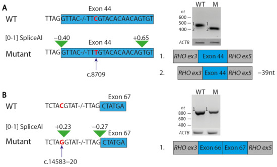 - Albert, S.; Garanto, A.; Sangermano, R.; Khan, M.; Bax, N.; Hoyng, C.B.; Zernant, J.; Lee, W.; Allikmets, R.; Collin, R.W.; et al. Identification and Rescue of Splice Defects Caused by Two Neighboring Deep-Intronic ABCA4 Mutations Underlying Stargardt Disease. Am. J. Hum. Genet. 2018, 102, 517–527. [Google Scholar] [CrossRef]