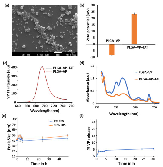 Characterization of PLGA–VP–TAT and PGLA–VP nanoparticles in solution (a) SEM image, (b) Zeta potential in water, (c) florescence spectra of VP (425 nm ex/690 nm em) from the NPs in water, (d) absorbance spectra in water, showing the VP and TAT peaks, (e) PLGA–VP–TAT NP stability in PBS with and without FBS, as measured by the nanoparticle peak size, (f) % release of VP from PLGA–VP–TAT NPs in PBS at 37 °C.