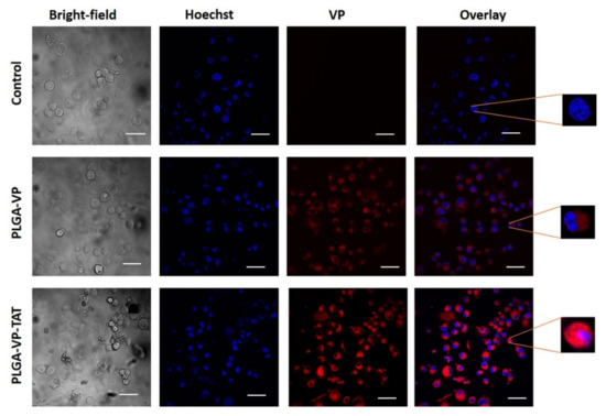 The uptake of the PLGA–VP and PLGA–VP–TAT NPs was measured at 4 h incubation, which was found previously to be optimal (i.e., gave the maximum NP uptake) [17]. As seen in Figure 2, there was no measurable VP signal present in the control group (cells only). The signal was ~2-fold higher for PLGA–VP–TAT NPs than for the untargeted NPs (p = 0.009) (Supplementary Figure S3) and the magnified single-cell images with TAT targeting showed some VP signal within the nuclei. The enhanced cellular uptake of the TAT-targeted NPs is attributed to the stronger adsorption onto the cell membrane due to electrostatic interaction between the cationic TAT peptide and heparan sulfate proteoglycans (HSPGs) on the cell surface [42].