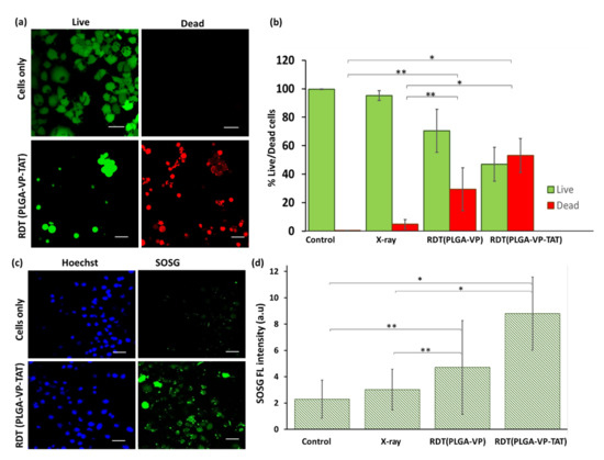 Cell viability and singlet oxygen generation following RDT. (a) representative confocal fluorescence image of live (green) and dead (red) cells following RDT with PLGA–VP–TAT NP and 4 Gy, compared to no-treatment controls, (b) corresponding cell viability, (c) representative confocal fluorescence image of SOSG fluorescence (green) and nuclear staining (blue) following 4 Gy RDT with PLGA–VP–TAT NPs compared to untreated controls, (d) SOSG fluorescence in treated and control cells, * p < 0.05 and ** p < 0.5. Scale bar: 50 µm.
