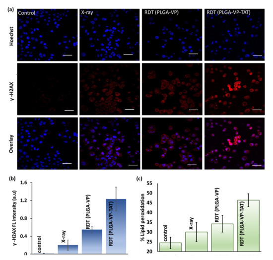 RDT-induced apoptosis and necrosis are shown in Supplementary Figure S7: cells treated with nuclear-targeted RDT showed significant higher levels of necrotic cell death than non-targeted RDT or controls, with necrosis being more pronounced than apoptosis. This reduction in the cell membrane integrity is supported by the measurement of lipid peroxidation [45] shown in Figure 3d and discussed more in Supplementary Section S8 (Figure S8). Figure 4b shows ~90% increase in lipid peroxidation for RDT using the TAT-targeted NPs compared to untreated controls, which was significantly higher (p < 0.05) than RDT with the untargeted PLGA–VP NPs (~40%) or with radiation alone (~20%).