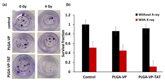 The cell viability assays above do not determine the clinically important long-term response of cancer cells after treatment [12] since they do not account for altered proliferative capacity or repair of sublethal damage [46]. The results of the clonogenic assay [47] are shown in Figure 5. There was a significant difference in the number of colonies (colonies > 50 cells) following RDT treatment with PLGA–VP–TAT NPs compared to RDT with untargeted NPs (p < 0.005), X-rays only (p < 0.001), and no treatment (p < 0.001).