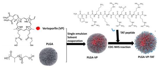 The PLGA–VP–TAT nanoparticles were prepared by conjugating the TAT peptide to the nanoparticle surface through an EDC–NHS reaction. EDC couples NHS to a carboxylic group in the PLGA, forming a highly stable NHS ester, and this allows efficient conjugation to primary amines in the TAT peptide. The conjugation procedure was as follows: 2 mL of PLGA–VP stock was centrifuged, the supernatant was removed, and 1.2 mL PBS was added. Then, 30 mg of NHS and 60 mg of EDC were added before incubation for 2 h in an orbital shaker (200 rpm). A 100 µM TAT stock was first prepared, then 60 µL of TAT stock in 200 µL of PBS was added. This mixture was kept overnight in a shaker (150 rpm), washed, centrifuged at 12,500 rpm for 10 min, redispersed in 2 mL of DI water and stored in the dark at 4 °C. The main formulation steps are illustrated in Figure 6.