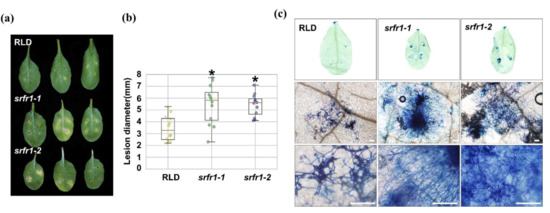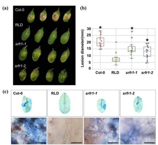 Figure 2. Response of Arabidopsis srfr1 mutants to the necrotrophic fungal pathogen, Botrytis cinerea. (a) Fungal spores of B. cinerea grown on PDA were harvested and inoculated onto detached leaves of Arabidopsis RLD, srfr1-1, and srfr1-2 mutants at a concentration of 1 × 108 spores/mL. Photographs were taken at 5 DPI; (b) box plots of lesion size at 5 DPI in RLD, srfr1-1, and srfr1-2. The y-axis displays the measured diameter of disease lesions (mm, n = 12) in each plant. The box ranges were determined from the twenty-fifth to the seventy-fifth percentiles. A statistically significant difference was determined by the Student’s t-test (* p < 0.01); (c) leaves were collected 3 DPI with B. cinerea and stained with lacto-phenol trypan blue to visualize the extent of hyphal development. Scale bar: 200 μm.