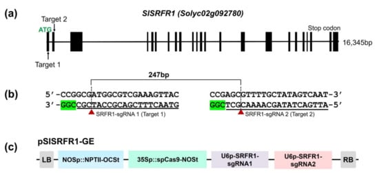 Figure 3. Tomato SRFR1 gene structure and vector construction for CRISPR/Cas9-mediated genome editing in SlSRFR1. (a) Predicted SlSRFR1 gene structure and the position of guide RNAs in SlSRFR1. The black box denotes exon, and the line means intron. Two guide RNAs are indicated with an arrow in the first and the second exons, respectively; (b) target sequences of sgRNAs. Predicted cut sites by CRISPR/Cas9 are denoted with red triangles and dotted lines; (c) construction of CRISPR/Cas9-mediated genome editing for SRFR1 in tomato. NPTII was used for a plant selection marker. Two guide RNAs were expressed by AtU6 promoter and terminated by poly T.