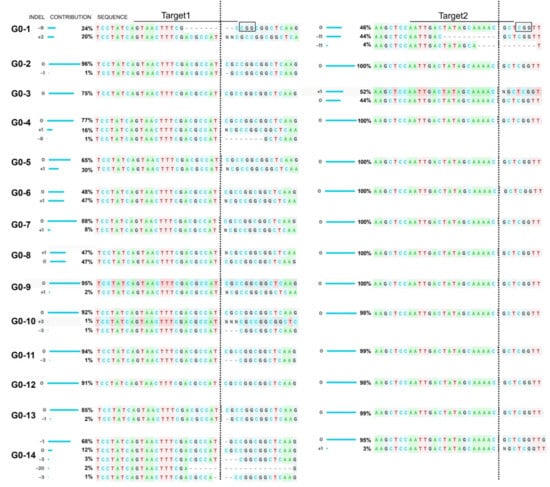 In the first generation (G0), 37 plants were regenerated from transformed cotyledons. Genomic DNA was isolated from the generated plants to verify potential genome editing events. The targeted DNA region was amplified using gene-specific primers by polymerase chain reaction (PCR). PCR products amplified from wild-type M82 and G0 leaves showed similar size after electrophoretic separation on the agarose gel, indicating no larger deletion occurred in the targeted area. Sanger sequencing data derived from PCR amplicons were subjected to decomposition analysis using Inference of CRISPR Edits (ICE) online tool [26]. Among the analyzed plants, indel mutations were detected in 14 G0 plants, resulting in a CRISPR/Cas9-mediated editing efficiency of 37.84% (Figure 4).