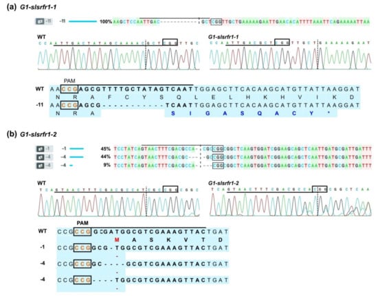 Figure 5. ICE analysis with amplified PCR fragments from slsrfr1 G1 plants, Sanger sequencing chromatograms in target sequence, and predicted amino acid sequences in two homozygous G1-slsrfr1 plants. (a) Eleven nucleotide deletions in slsrfr1-1 produces a premature stop codon, colored with blue; (b) 1 or 4 nucleotide deletions in slsrfr1-2 remove a start codon (M), colored with red. Nucleotide deletions are indicated by dashes (-). The PAM sites are boxed, and the target sequences of guide RNAs are overlined.