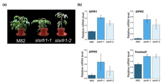 Figure 6. Altered morphology and expression of defense marker genes in CRISPR/Cas9-edited slsrfr1 plants. (a) Growth phenotype of 6-week-old M82 and slsrfr1 lines grown in 16 h light/8 h dark long-day photoperiod; (b) relative mRNA expression of defense-related genes. The genes used for gene expression analysis refer to SlPR1 (Solyc09g007010.1), SlPR2 (Solyc01g008620.2), SlPR5(Solyc08g080640), and TomloxD (Solyc03g122340.2). Gene expression levels of each gene were normalized with SlACT (Solyc04g011500.3.1) as an internal control. Error bars represent standard deviation. A statistically significant difference was determined by the Student’s t-test (* p < 0.01).