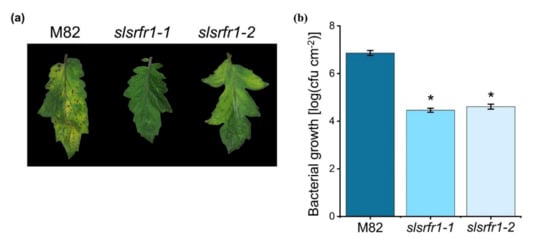 Figure 7. Response of slsrfr1 lines to the bacterial pathogen Pseudomonas syringae pv. tomato DC3000. (a) Disease symptoms of parental M82 (left), slsrfr1-1 (middle), and slsrfr1-2 (right) dip-inoculated with Pto DC3000. Disease symptoms (leaf chlorosis) were recorded at 5 DPI. Only the fourth trifoliate leaflet of the plants was inoculated; (b) in planta bacterial growth was measured in indicated plant lines on day 5 after inoculation with Pto DC3000 at a density of 2 × 108 cfu/mL. Values represent averages of cfu/cm2 leaf tissue from four replicas, and error bars denote standard deviation. Asterisks indicate that the growth of DC3000 was significantly different between M82 and slsrfr1 mutants as determined by a two-tailed Student’s t-test (* p < 0.01). This experiment was repeated twice with similar results.