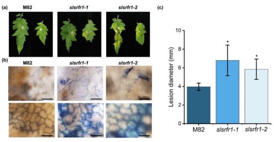 Figure 8. Plant response to Fusarium oxysporum f. sp. lycopersici in slsrfr1 lines. Plant response was analyzed at 3 days after plug inoculation of FOL in slsrfr1 lines. (a) Detached leaves from 6-week-old M82, slsrfr1-1, and slsrfr1-2 were inoculated with 4 mm-diameter plugs of F. oxysproum. Photographs were taken at 3 DPI; (b) Trypan blue staining in FOL-inoculated slsrfr1 lines. The bar represents 200 μm in the upper layer and 100 μm in the lower layer; (c) lesion size at 3 DPI in slsrfr1 lines. Plant response of slsrfr1-1 and slsrfr1-2 against FOL was repeated three times and once, respectively, with similar results. A statistically significant difference was determined by the Student’s t-test (* p < 0.01).