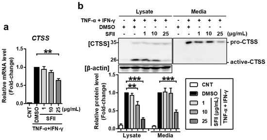 We then checked whether SFII could also alleviate CTSS expression. CTSS mRNA expression was significantly inhibited by 25 μg/mL of SFII treatment (Figure 2a). Using western blotting, CTSS proteins could be detected in two forms, pro-CTSS (35 kDa) and active CTSS (25 kDa). In the lysate, active CTSS was expressed at higher levels than pro-CTSS (Figure 2b). Both forms were significantly increased by TNF-α/IFN-γ-stimulation. However, SFII treatment (10 to 25 μg/mL) significantly suppressed only active CTSS, and not pro-CTSS, in a dose-dependent manner. Meanwhile, in the medium, only pro-CTSS was mainly detected, and active-CTSS was hardly found. Pro-CTSS in the medium was significantly induced by TNF-α/IFN-γ and was significantly inhibited by treatment with SFII at a concentration of 25 μg/mL. Taken together, SFII not only inhibits TNF-α/IFN-γ-induced TARC and MDC but also inhibits CTSS.