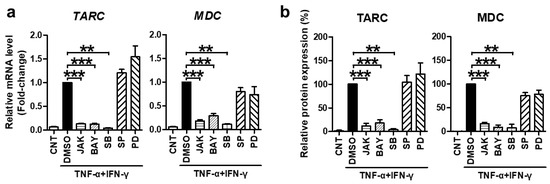 TNF-α/IFN-γ-induced TARC and MDC expression were mediated by STAT1, NF-κB, and p38 MAPK. Cells were pretreated with the JAK I inhibitor (JAK, 5 μM), BAY 11-7082 (BAY, 25 μM), SB203580 (SB, 40 μM), SP600125 (SP, 20 μM), PD98059 (PD, 20 μM), or DMSO for 30 min and then stimulated with TNF-α/IFN-γ for 18 h (for mRNA) or 24 h (for protein). (a) The expression of TARC and MDC mRNA was measured by quantitative real-time PCR. (b) Protein levels of TARC and MDC were measured using ELISA with the conditioned media. The mRNA and protein levels, relative to those in the TNF-α/IFN-γ-stimulated DMSO control samples, are presented as mean fold-changes ± SEM of independent experiments (N = 3 or 4). Statistical comparisons were performed using a one-way ANOVA followed by Bonferroni’s post-hoc test (** p < 0.01, *** p < 0.001).
