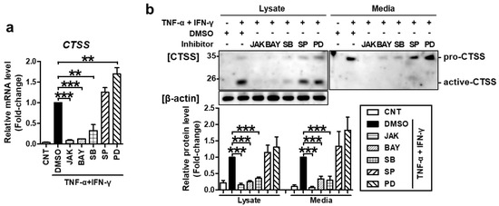 TNF-α/IFN-γ-induced CTSS expression was mediated by STAT1, NF-κB, and p38 MAPK. Cells were treated as in Figure 3. (a) The expression of CTSS mRNA was measured by quantitative real-time PCR. (b) Protein levels of CTSS in cell lysates or conditioned media were measured by western blotting. Band intensity was analyzed using ImageJ software and the combined sum of pro and active CTSS band intensities was normalized to that of β-actin. The mRNA and protein levels, relative to those in the TNF-α/IFN-γ-stimulated DMSO control samples, are presented as mean fold-changes ± SEM of independent experiments (N = 3 or 4). Statistical comparisons were performed using a one-way ANOVA followed by Bonferroni’s post-hoc test (** p < 0.01, *** p < 0.001).