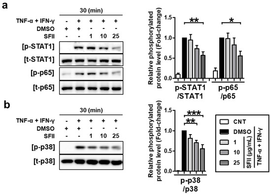 We next examined the effects of SFII on TNF-α/IFN-γ-induced phosphorylation of STAT1, p65, and p38 MAPK. HaCaT cells were pretreated with the indicated concentrations of SFII for 30 min and stimulated with TNF-α/IFN-γ for 30 min, and then, lysates were harvested. As shown in Figure 5a, SFII inhibited the phosphorylation of STAT1 (p-STAT1) and p65 (p-p65 NF-κB) induced by TNF-α/IFN-γ. The densitometry results of the phosphorylation form versus total form revealed that SFII significantly suppressed both p-STAT1 and p-p65 at 25 μg/mL.