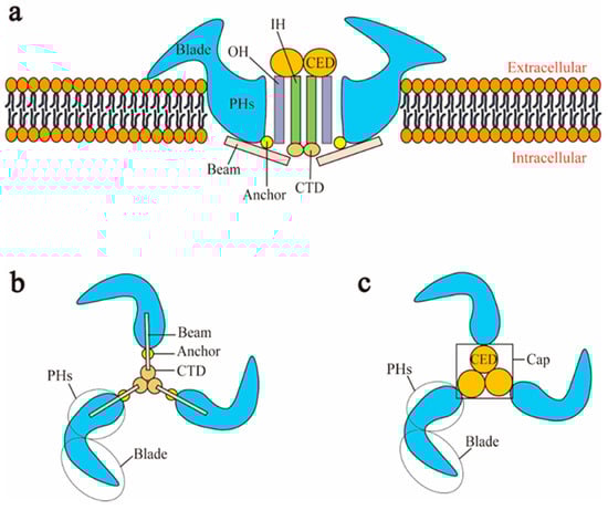 Schematic representation of Piezo1 channel. (a) Lateral view; (b) bottom view; (c) top view. CED: C-terminal extracellular domain; CTD: intracellular C-terminal domain; IH: inner helix; OH: outer helix; PHs: peripheral helices.