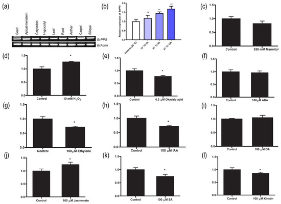BrPP5.2 expression profiling across different tissues and treatment. (a) RT-PCR results showed the expression of BrPP5.2 in vegetative (apical meristems, cotyledon, hypocotyl, leaf, and root) and reproductive (seed, anther, carpel, and silique) tissues of B. rapa. (b–l) The quantitative RT-PCR results showing the relative expression pattern of BrPP5.2 in B. rapa exposed to a high temperature (37 °C) at different times (b), exogenously supplied 350 mM Mannitol (c), 10 mM hydrogen peroxide (d), AtPP5 inhibitor, okadaic acid (0.3 µM) (e), and phytohormones (100 µM each) such as abscisic acid (f), ethephon (g), indole acetic acid (h), gibberellins (i), methyl jasmonate (j), salicylic acid (k) and kinetin (l). Each column represents the normalized gene expression values derived from qRT-PCR replicates, while error bars denote the standard deviations. One-way ANOVA (Dunnett’s multiple comparisons) test was performed in GraphPad Prism 8.0.2 to determine the significant variation from controls grown under optimal growth conditions. Ns = non-significant; * = p < 0.05; ** = p < 0.01; *** = p < 0.001. BrACT2 was used for gene expression normalization.