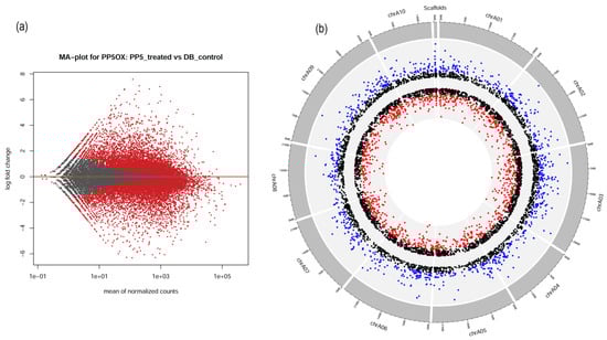 The transcriptomic signatures of BrPP5.2 overexpressing transgenic B. rapa lines. (a) The MA plot represents the differentially expressed genes (DEGs) (FDR < 0.05) derived from RNA sequencing data of transgenic lines compared to those of non-transgenic controls. (b) The circus plot depicts DEGs across the 10 B. rapa chromosomes. The color codes represent the significance levels of DEGs. The red spots indicate the downregulated DEGs (logFC ≤ |−2|; FDR < 0.05), and blue spots (logFC ≥ |2|; FDR < 0.05) represent the upregulated DEGs in BrPP5.2OX lines, while black spots represent the non-significant DEGs observed in differential gene expression analysis between transgenic and control lines.