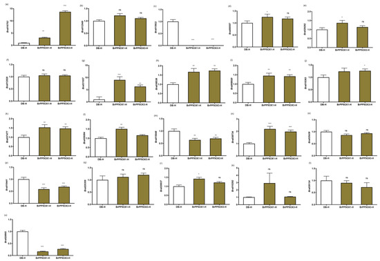 However, under high temperature (37 °C/1 h) stress conditions, most of the expression patterns of TSR genes were upregulated (Figure 5a–u). A total of 22 DEGs were investigated for their expression patterns in BrPP5.2OX lines and controls under high temperature stress conditions using qPCR. Of these, 11 DEGs comprising DWARF AND DELAYED FLOWERING 1 (DDF1; Bra016763), ATHSFA2 (Bra000557), AT-HSFB2A (Bra029292), BIP3 (Bra031657), MYO-INOSITOL-1-PHOSPHATE SYNTHASE 2 (MIPS2; Bra038538), 17.6 KDA CLASS II HEAT SHOCK PROTEIN (HSP17.6II; Bra008920), 17.6 kDa class I small heat shock protein (HSP17.6B-CI; Bra018383), ROF2 (Bra037477), Hsp70b (Bra026084), HSP70 (Bra038734), and CYTOCHROME P450 71B2 (CYP71B2; Bra026937) were significantly upregulated in transgenic lines. Conversely, four DEGs, ATHSP101 (Bra015922), MULTIPROTEIN BRIDGING FACTOR 1C (MBF1C; Bra015048), ABA INSENSITIVE 1 (ABI1; Bra010441), and HSP26.5-P (Bra020865), were significantly downregulated. The expression patterns of other genes, such as HSP17.4-CIII (Bra012949), AT-HSFA7A (Bra012828), TCH2 (Bra025439), tudor domain-containing protein, AT5G61780 (Bra029309), TCH4 (Bra010292), and PDR12 (Bra026124), were not significantly altered. Surprisingly, five of the six upregulated DEGs found under optimal conditions were downregulated under high temperature stress conditions (Figure 4c and Figure 5a–u; Data S6).