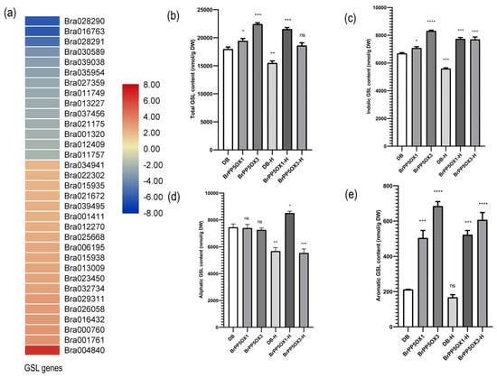 Expression pattern of GSL biosynthesis-related genes and GSL concentration in transgenic and control lines under normal and heat stress conditions. (a) The heatmap depicts the expression pattern of GSL genes in BrPP5 overexpressing transgenic lines compared to non-transgenic controls. (b–e) The graphs represent the UHPLC results (described in the methods section), revealing glucosinolate types and their concentration (nmol/g DW) in aerial tissues of 2-month-old transgenic and control lines (n = 15 or more) grown under optimal and high temperature/heat (37 °C for 1 h) stress conditions. (b) Total GSL content in non-transgenic controls (DB), transgenic lines (BrPP5OX1, BrPP5OX3), heat-stressed non-transgenic controls (DB-H), and heat-stressed transgenic lines (BrPP5OX1-H, BrPP5OX3-H). (c) Aliphatic GSL content in non-transgenic controls (DB), transgenic lines (BrPP5OX1, BrPP5OX3), heat-stressed non-transgenic controls (DB-H), and heat-stressed transgenic lines (BrPP5OX1-H, BrPP5OX3-H). (d) Indolic GSL content in non-transgenic controls (DB), transgenic lines (BrPP5OX1, BrPP5OX3), heat-stressed non-transgenic controls (DB-H), and heat-stressed transgenic lines (BrPP5OX1-H, BrPP5OX3-H). (e) The aromatic GSL content in non-transgenic controls (DB), transgenic lines (BrPP5OX1, BrPP5OX3), heat-stressed non-transgenic controls (DB-H), and heat-stressed transgenic lines (BrPP5OX1-H, BrPP5OX3-H). Each column represents the mean values derived from UHPLC duplicates, while error bars denote the standard deviations. One-way ANOVA (Dunnett’s multiple comparisons test) was performed using GraphPad Prism 8.0.2 to determine the significant variation from non-transgenic controls grown under optimal growth conditions. Ns = non-significant; * = p < 0.05; ** = p < 0.01; *** = p < 0.001; **** = p < 0.0001.