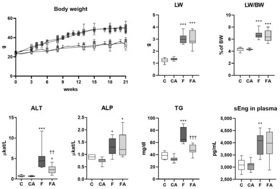 Atorvastatin treatment ameliorated the increased levels of ALT and TG found in the plasma of mice fed a NASH-inducing diet. NASH was induced in mice by 24 weeks of F diet consumption, with atorvastatin (A) administered orally (20 mg/kg/day) during the last three weeks. Corresponding control groups received a chow (C) diet. Abbreviations: BW—body weight, LW—liver weight, ALT—alanine aminotransferase, ALP—alkaline phosphatase, TG – triglycerides, sEng—soluble endoglin. Data are presented as median values, with boxes and whiskers representing the interquartile range and fifth to 95th percentiles, respectively. * p < 0.01, ** p < 0.01, and *** p < 0.001 atorvastatin and/or F-diet vs. vehicle-administered chow diet–treated mice; †† p < 0.01 and ††† p < 0.001 atorvastatin-treated vs. vehicle-treated NASH mice.